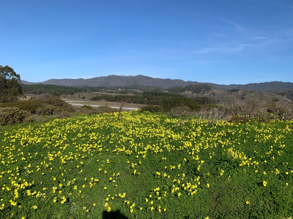 Today was our fourth visit to Pillar Point, with the last one on New Year’s Eve. It was sunny and breezy, comfortable for January. Buttercups were beginning to the return to the trail. Typically, we start on the Moss Beach side of the trail and hike south down to Pillar Point Harbor along dramatic bluffs overlooking the Pacific Ocean. In 1769 the Spanish explorer Gaspar de Portola landed here, before setting on foot toward Yerba Buena (present day San Francisco). Doubtless, and thanks to the efforts of preservationists, de Portola and I saw the same coast, the same coastal mountain range, the same perfect blue sky. In his journey to the present-day San Francisco, de Portola passed the valley through which (much later) the Sawyer Camp Trail would run. More on this in a future post.
