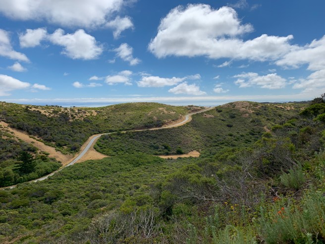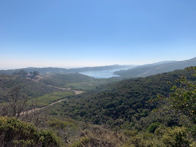 The Sweeney Ridge Trail starts at the end of Sneath Lane, in San Bruno, California, about 15 miles south of San Francisco. Due south are San Andreas (yes, same as the fault) Lake and Crystal Springs Reservoir, which is fed by Hetch Hetchy Reservoir, in Yosemite, more than 180 miles to the east. It is as gorgeous and vibrant an area as any, except perhaps on hot, hazy days, with moderate (or worse) air quality. At the top of the trail, at the Portola Discovery Site, on a clear day you can enjoy a 360 degree view of Montara Mountain, to the south, Mount Diablo, to the east, Mount Tam, to the north, and the mighty Pacific, to the west. As intimated above, my most recent Sweeney Ridge Trail hike was not one which afforded those crystal clear, postcard views. Air quality, while technically moderate, seemed poor, gritty, metallic. It was unusually hot, especially given our proximity to the coast, with little wind. Relentless flies descended on the trail. Two hours of near incessant (but quite justifiable) complaining and nagging, from some members of our intrepid hiking crew. My dog, Roxy, could not decide if she wanted to walk with my spouse or me; she preferred my (faster) pace, but did not want to leave my spouse’s side. The distance was short (5 miles), but everyone (especially the other dog in our expedition) felt sluggish, feet stuck in mud (perhaps a metaphor for the past 18+ months). The end could not come soon enough. Simply put, same trail, very different hike.