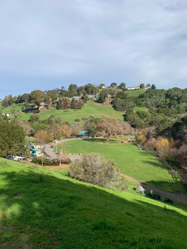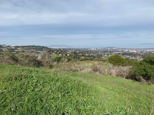 The surge continues. But, at Sugarloaf Peak, in San Mateo, but for a masked hiker (new show?) or two, it might as well be business as usual. Mind you, Sugarloaf was not my first choice. Pulgas Ridge (https://johnpavolotsky.com/2021/12/24/pulgas-ridge-and-hiking-year-in-review/), my go-to for dog friendly hikes, was packed, no parking except on the streets, perhaps a third of a mile or more from the entrance, and so it was Sugarloaf, much smaller, but also closer to my house, isolated enough in spots to get away from it all, from news of travelers being stranded from Dubai to Chile due to positive COVID tests, soaring local positivity rates, daily close contact letters, schools going remote, a state of emergency in Alpine County, just south of Lake Tahoe (https://johnpavolotsky.com/2022/01/03/lake-tahoe/), lots of streaming (thank you, broadband Internet), and in some respects back to the future (or at least 2020). No tsunami in sight from my 500-foot vantage point, just a hawk or two, green hills, coastal oaks, no wind, relatively warm (60 degree F) January air, clear sky with a few high clouds.