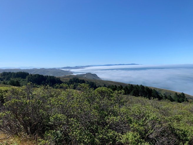 Fabulous views in all directions, with Stinson Beach (of course) below, the fog rolling into the various inlets and valleys, Salesforce Tower and Sutro Tower above the San Francisco fog line, Mount Diablo to the east, strong, tall, impervious. Redwoods, Monterrey Pines, Bay Trees, Cypress Trees, ferns and more ferns, a gurgling creek, hawks soaring – who could ask for more? I was asked if this is my favorite hike so far. Top two, for sure, with Diablo as the other candidate. Difficulty level, relative to my other hikes: 7 out of 10. Diablo, which very much deserves the Black Box warning I give it, is a 10. My preferred route on Mission Peak, definitely an 8 and possibly a 9. Dipsea is strenuous, but manageable.
