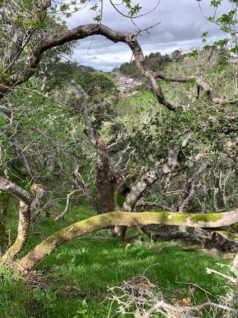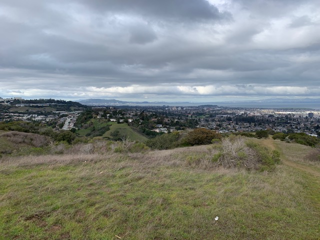 I have hiked Sugarloaf Peak, in Laurelwood Park, many times. 0.9 miles to the top, San Bruno Mountain and San Francisco to the north, the coastal range to the west, the Bay and Diablo to the east, and the Belmont hills to the south. Somewhat tricky conditions yesterday, for reasons that might not be entirely apparent. It had rained, unexpectedly, the night before. I can deal with mud, and it’s quite likely that my hiking companion (below) prefers it, but I try to avoid it if possible. Hiking is fun; cleaning is not. There are more than a few trails to the top, as well as more than a few around the mountain. Needless to say, the ones at or near the top were in reasonably good condition, while the ones near the bottom required, well, creativity. Some zigging and zagging, and understandable confusion from my companion. Probably 3 miles in total, so not too bad. Cool and blustery, especially at the top, but, ultimately, grey skies giving way to weak winter sunlight, flitting across mangled moss-covered oak trees and tall green grass.