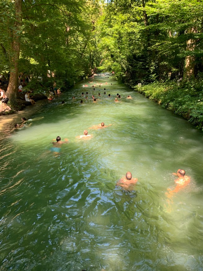 - 23,000 steps on a sweltering Saturday in Munich, starting in the Viktualientmarkt (Farmers’ Market), cooling off (with the rest of the city) in the Englischer Garten, and strolling through Olympiapark, before returning to our hotel near Marienplatz. Rest well earned.
